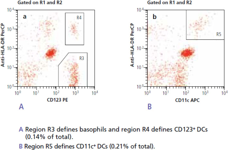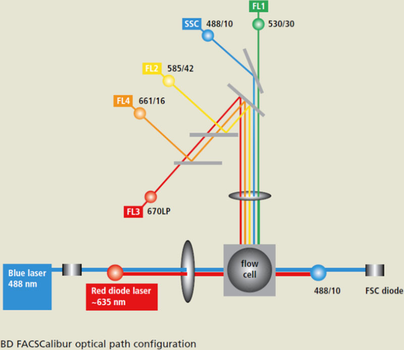 Three fluorescence channels and two scatter channels are available from the 488 nm laser (FSC, SSC, FL1, FL2, FL3). One fluorescence channel is available from the 633 nm laser (FL4).
