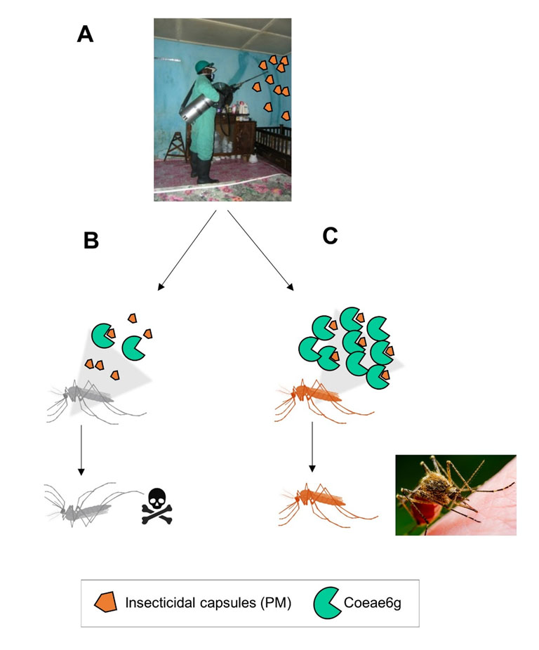 Actellic300S (microencapsulated Pirimiphos methyl - PM) is a new, highly effective insecticide formulation, recently introduced in malaria control campaigns in Africa after many years of development. In this study, published in the prestigious journal Nature Communications (https://doi.org/10.1038/s41467-025-65827-4), a predictive chemo-proteomic framework was developed to identify enzymes that can bind to insecticides. Application of the methodology revealed that the carboxyl-esterase Coeae6g is capable of binding to the active insecticidal molecule. Using genetic modification approaches and biochemical characterization, it was proven that Coeae6g acts like a sponge that binds PM, and prevents it from reaching its final molecular target in the mosquito’s nervous system. Transgenic mosquitoes over-expressing Coeae6g display a resistant phenotype against PM, via this sequestration mechanism. Added to that, Coeae6g was shown to act in a similar way on additional insecticides, widely used in vector control interventions, leading to cross resistance.