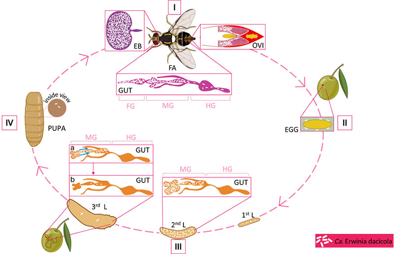 | Life cycle of the fly highlighting the organs that harbor the bacteria |
