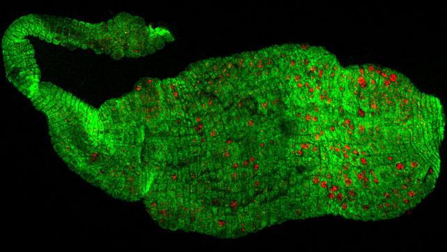| Ooocysts (red) on mosquito midgut (green) |