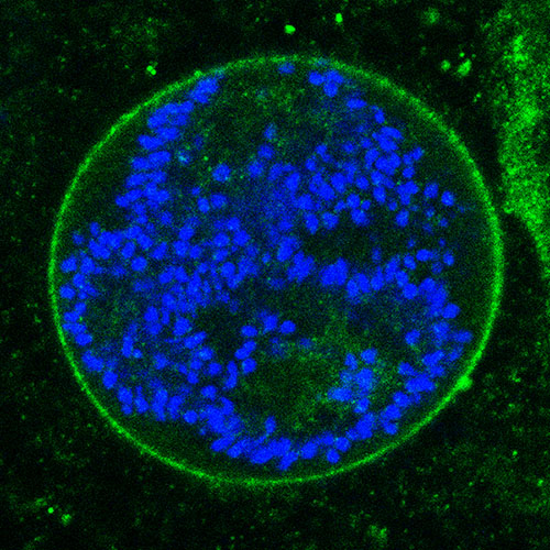 Oocyst with sporozoites being formed (DNA, blue) and ORP protein in the periphery (green)