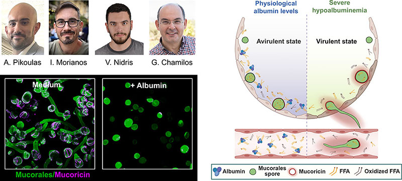 | Εικόνα 1: Πάνω αριστερά, οι κύριοι ερευνητές που συμμετείχαν στην εργασία, Αντώνης Πίκουλας, Γιάννης Μοριανός, Βασίλης Νιδρής και ο επικεφαλής της εργασίας καθ. Γιώργος Χαμηλός. Κάτω αριστερά απεικονίζονται σπόρια των μυκήτων της οικογένειας Mucorales (πράσινο) τα οποία αναπτύσσονται και παράγουν την τοξίνη Μουκορικόνη (Mycoricin) (μωβ). Παρουσία αλβουμίνης, αναστέλλεται επιλεκτικά η ανάπτυξη των σπορίων και η τοξίνη δεν εκκρίνεται. Στα δεξιά παρουσιάζεται ο μηχανισμός δράσης της αλβουμίνης. Η αλβουμίνη σε φυσιολογικά επίπεδα δεσμεύει τα ελεύθερα λιπαρά οξέα (FFA) και τα προστατεύει από την οξείδωση. Εκείνα στη συνέχεια εισέρχονται στα σπόρια του μύκητα (Mucorales spores) και εμποδίζουν την ενεργοποίηση γονιδίων σημαντικών για την ανάπτυξή τους. Σε περιπτώσεις σοβαρής υποαλβουμιναιμίας, τα ελεύθερα λιπαρά οξέα οξειδώνονται (oxidized FFAs) , οι μύκητες αναπτύσσονται, παράγουν Μουκορικόνη (Mucoricin) και προκαλούν λοίμωξη. |